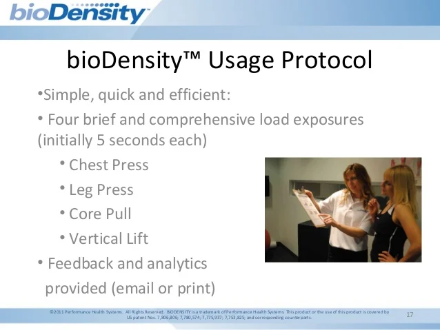 After completing a bioDensity session you may feel like you’ve completed physical work. You will feel warm from increased blood circulation and from work completed by the muscles. Within 24 hours you may feel muscular fatigue, but you are not likely to feel soreness. Since the movements only require five (5) seconds of maximal work, your body will not produce the by-products which cause muscle soreness. Users often comment on their improved mood and confidence as a result of their documented success.